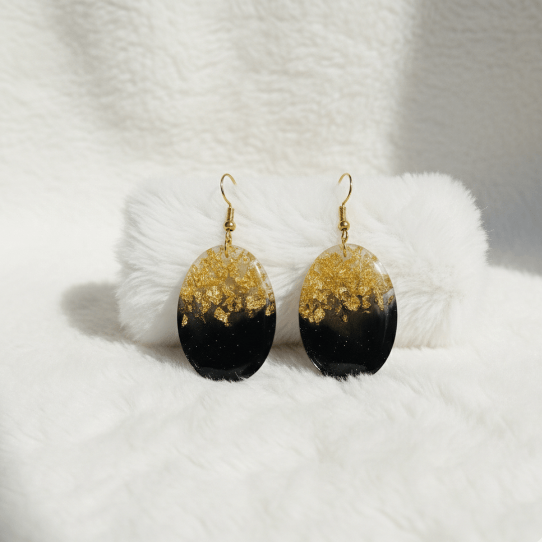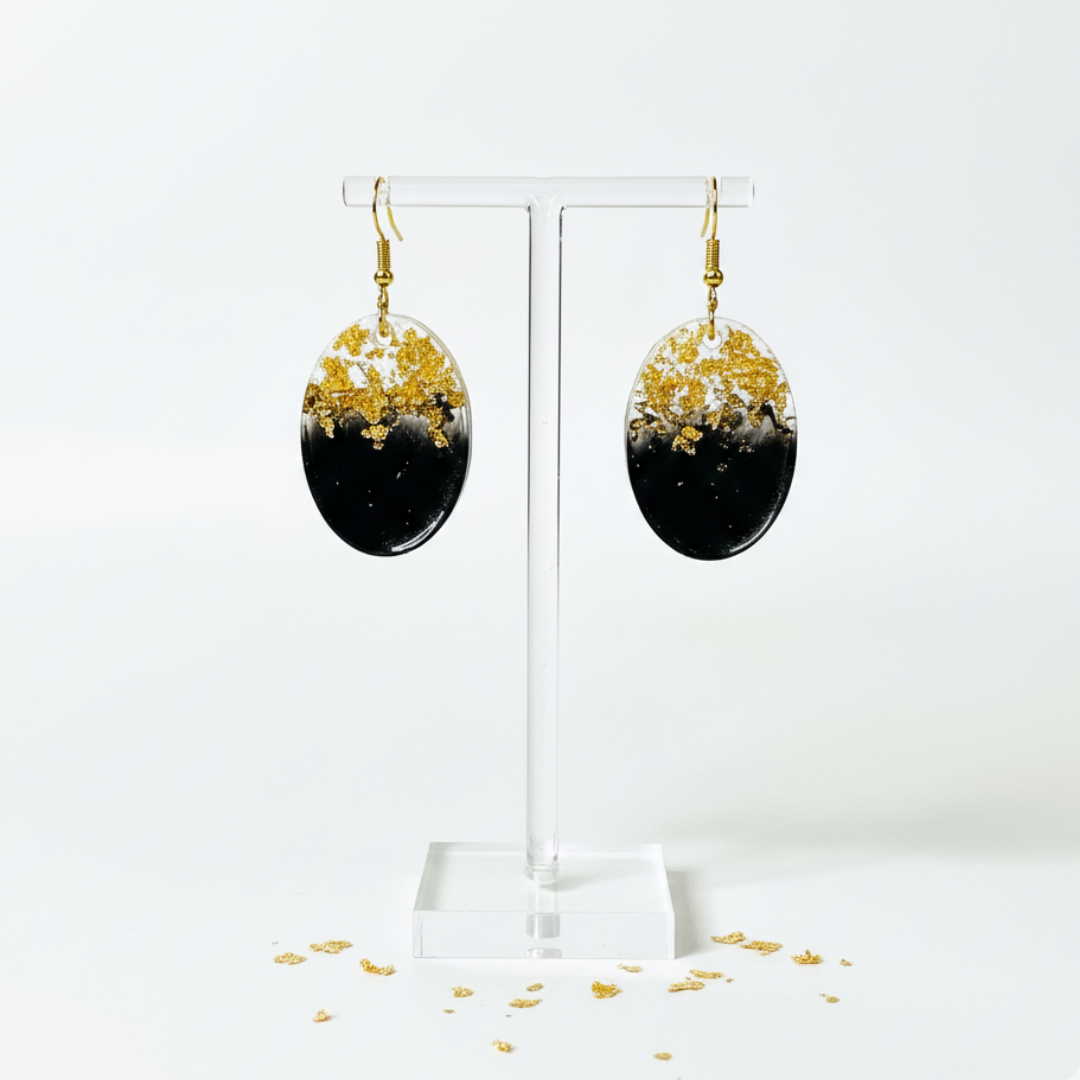 • Material: Clear epoxy resin with black pigment and gold foil flakes, gold-plated metal hooks.