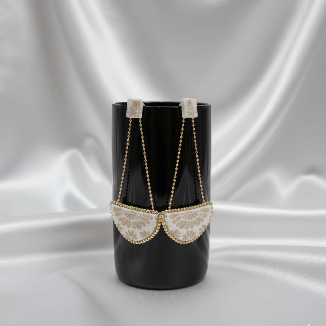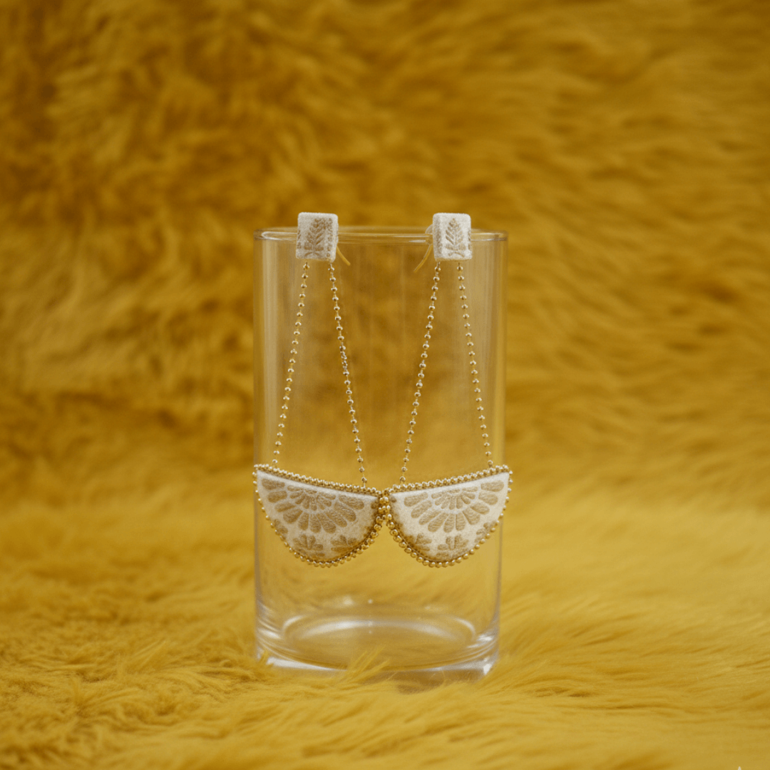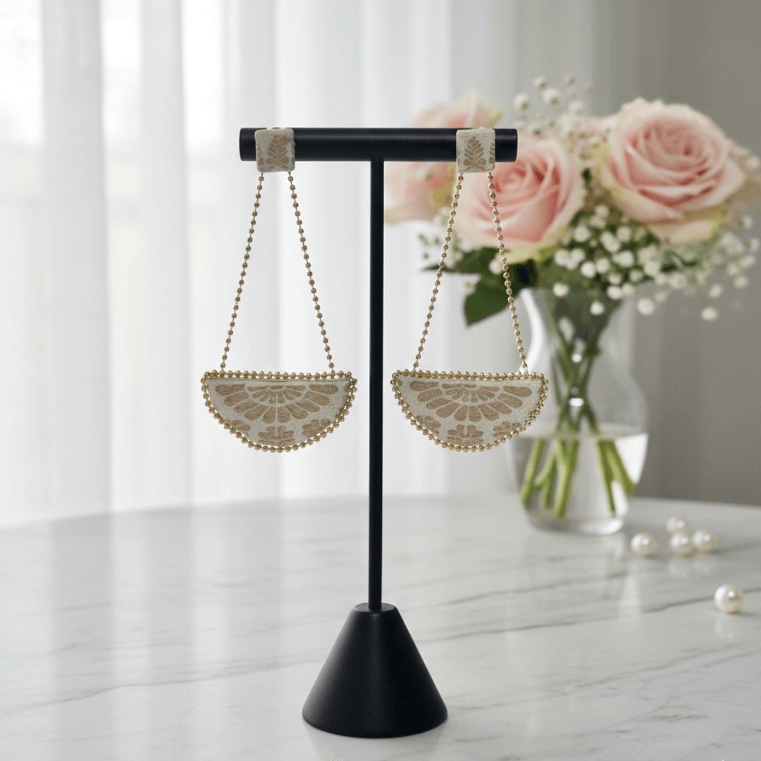 The earrings are Assam silk golden jari, semi-circular danglers with white base and gold embroidered floral patterns. They have gold beaded trims around the edges and gold chain connectors leading to square white fabric tops with gold embroidery, finished with gold earring hooks.